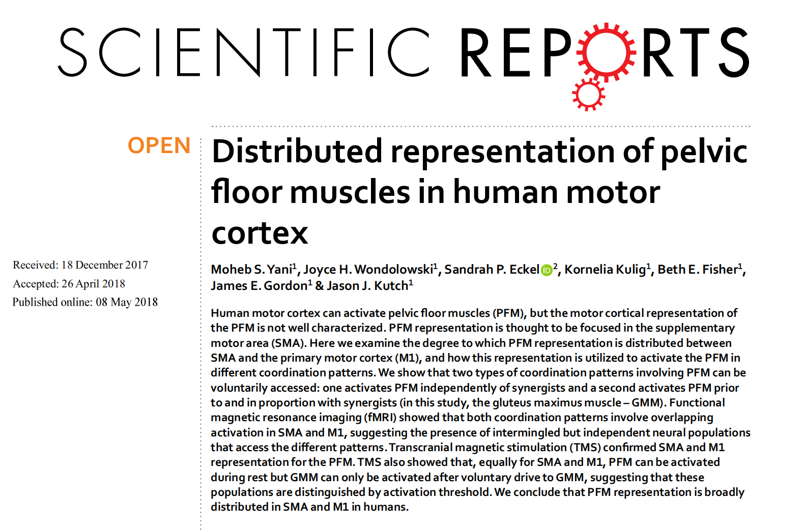 1. Yani MS, Wondolowski JH, Eckel SP, Kulig K, Fisher BE, Gordon JE, Kutch JJ. Distributed representation of pelvic floor muscles in human motor cortex. Sci Rep. 2018 May 8;8(1):7213. doi: 10.1038/s41598-018-25705-0. PMID: 29740105; PMCID: PMC5940845.