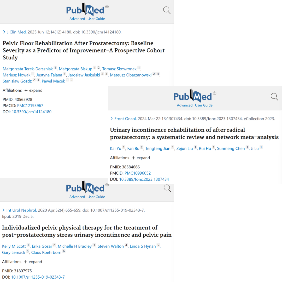 4. Terek-Derszniak M, Biskup M, Skowronek T, Nowak M, Falana J, Jaskulski J, Obarzanowski M, Gozdz S, Macek P. Pelvic Floor Rehabilitation After Prostatectomy: Baseline Severity as a Predictor of Improvement-A Prospective Cohort Study. J Clin Med. 2025 Jun 12;14(12):4180. doi: 10.3390/jcm14124180. PMID: 40565928; PMCID: PMC12193967.